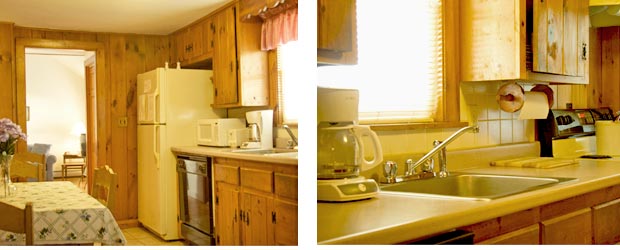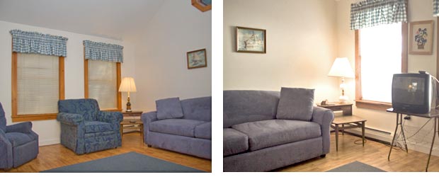 This cottage will accommodate up to 6 people with two bedrooms and a full-size sofa bed in the Living Room. This cottage is just steps away from the private beach with a lake view (shown left) from the bedroom. |